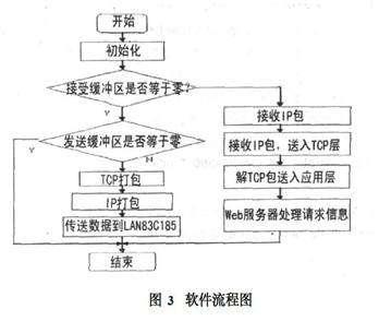 本系統的RJ – 45為系統與局域網的接口。由于大部分局域網都采用以太網,這里的LAN83C185就是用于處理以太網協議( IEEE 802. 3)的。數據的流向是請求信息從局域網中來,通過RJ – 45送到LAN83C185,處理后的數據包送入DSP系統的協議棧,由協議棧對數據包進行解析,得到原始請求信息。請求信息再經過DSP系統的處理,產生響應信息。響應信息通過局域網傳送到用戶的瀏覽器。整個系統的軟件流程如圖3所示。
