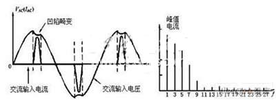 對于逆變器的整流環(huán)節(jié)(AC-DC),傳統(tǒng)的方法仍采用不控整流將通用交流電網(wǎng)提供的交流電經(jīng)整流變換為直流。雖然不控整流器電路簡單可靠,但它會(huì)從電網(wǎng)中吸取高峰值電流,使輸入端電流和交流電壓均發(fā)生畸變。也就是說,大量的電器設(shè)備自身的穩(wěn)壓電源,其輸入前置級電路實(shí)際上是一個(gè)峰值檢波器,在高壓電容濾波器上的充電電壓,使得整流器的導(dǎo)通角縮短三倍,電流脈沖成了非正弦波的窄脈沖,因而在電網(wǎng)輸入端產(chǎn)生失真很大的諧波峰值干擾,如圖2所示。