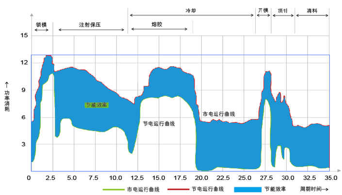 美世樂注塑機節電控制柜針對塑膠行業注塑機、吹塑機等設備加工的工藝特點,通過采集注塑機流量與壓力控制變化信號,自動調節油泵電機的轉速,進而調節油泵供油量,使油泵實際供油量與注塑機實際負荷在任何工作過程均保持一致。徹底消除了溢流與液壓油發熱現象,使注塑機從定量泵改為了變量泵,這樣使注塑機在不影響生產產量與質量的前提下,既延長了管道的使用壽命,又大大節省了油泵電機的電能消耗。