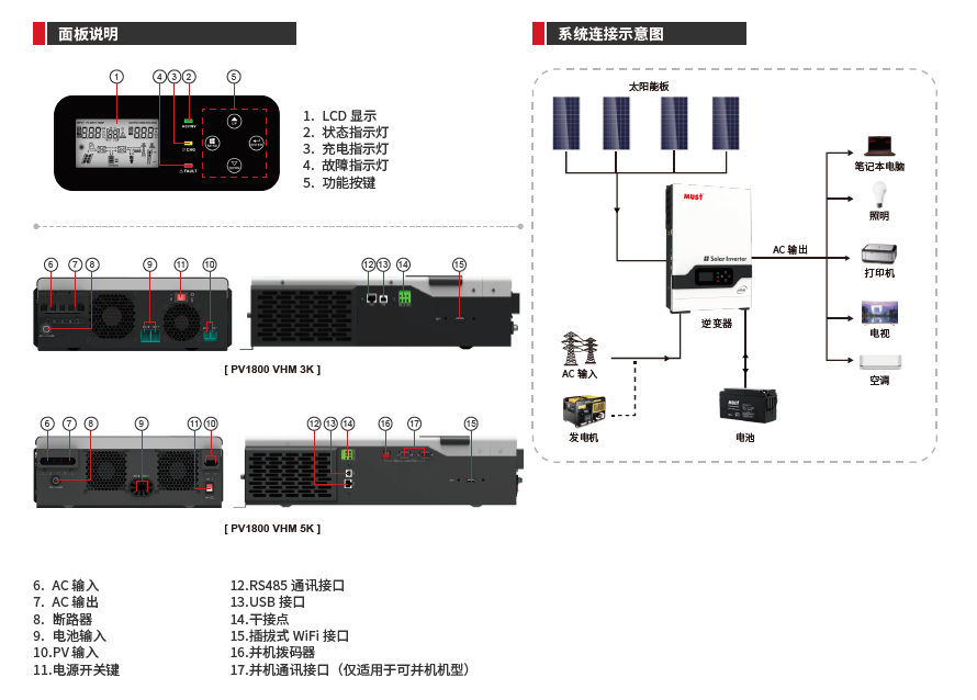 PV1800 VHM 系列是一款純正弦波高頻太陽能逆變控制一體機、內含MPPT 光伏控制器、AC 充電器、逆變器三大功能模塊;控制器采用先進的MPPT 計算方法和智能的電池管理,保證了最大能量的獲取;逆變器采用高頻設計,具有功率密度高、體積小、操作簡單、整機效率高、空載損耗小等優點。廣泛應用于戶用型系統、通訊基站、監控系統、牧區、5G 輔助供電等。