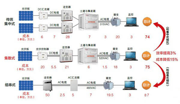 集散式逆變器方案中,將“傳統匯流箱”小幅升級,承擔了逆變器的MPPT跟蹤功能并增加了升壓功能,成為“控制器”,逆變器承擔任務減少。