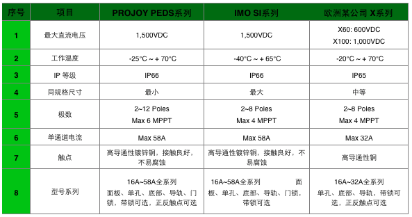 由于1500V系統電壓設計將成為主流趨勢,未來在系統選型中需要關注直流開關電壓設計。而目前市面上一般品牌的直流開關都可以斷開1000V的系統直流電壓,但是很少有可以斷開1500V的直流輸入。從各大直流開關了解到的最新數據顯示,國外能提供1500V最大直流電壓的開關制造商只有IMO等少數品牌,國內目前僅PROJOY(蘇州普兆)一家。