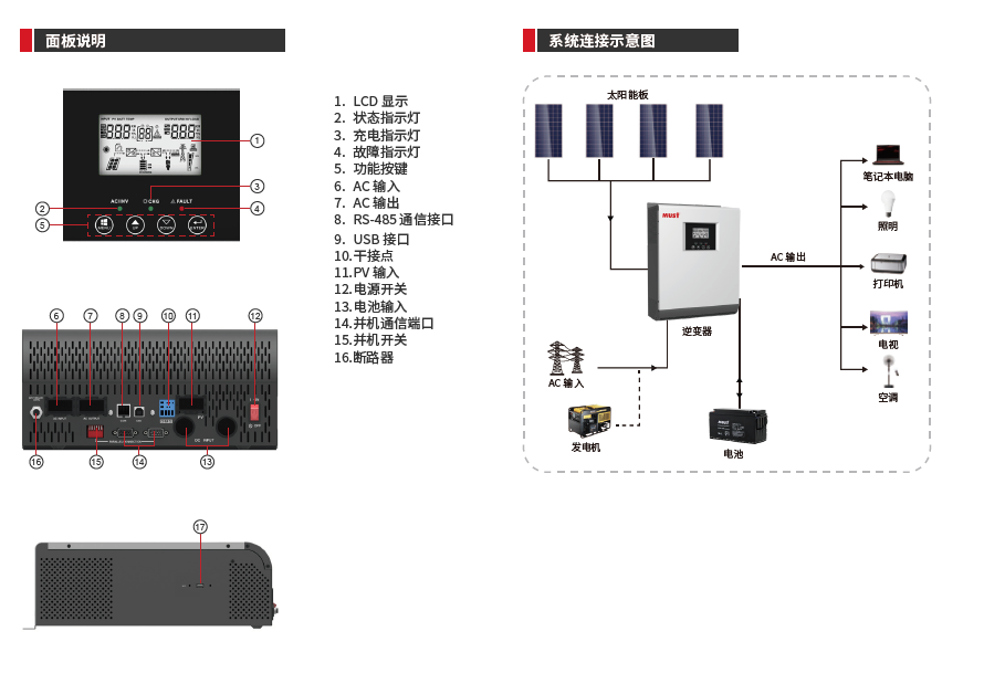 PV1800 LHM 系列是一款純正弦波高頻太陽能逆變控制一體機(jī)、輸出電壓為110V,逆變器采用高頻設(shè)計,具有功率密度高、體積小、操作簡單、整機(jī)效率高、空載損耗小等優(yōu)點(diǎn)。廣泛應(yīng)用于戶用型系統(tǒng)、通訊基站、監(jiān)控系統(tǒng)、牧區(qū)、5G 輔助供電等。