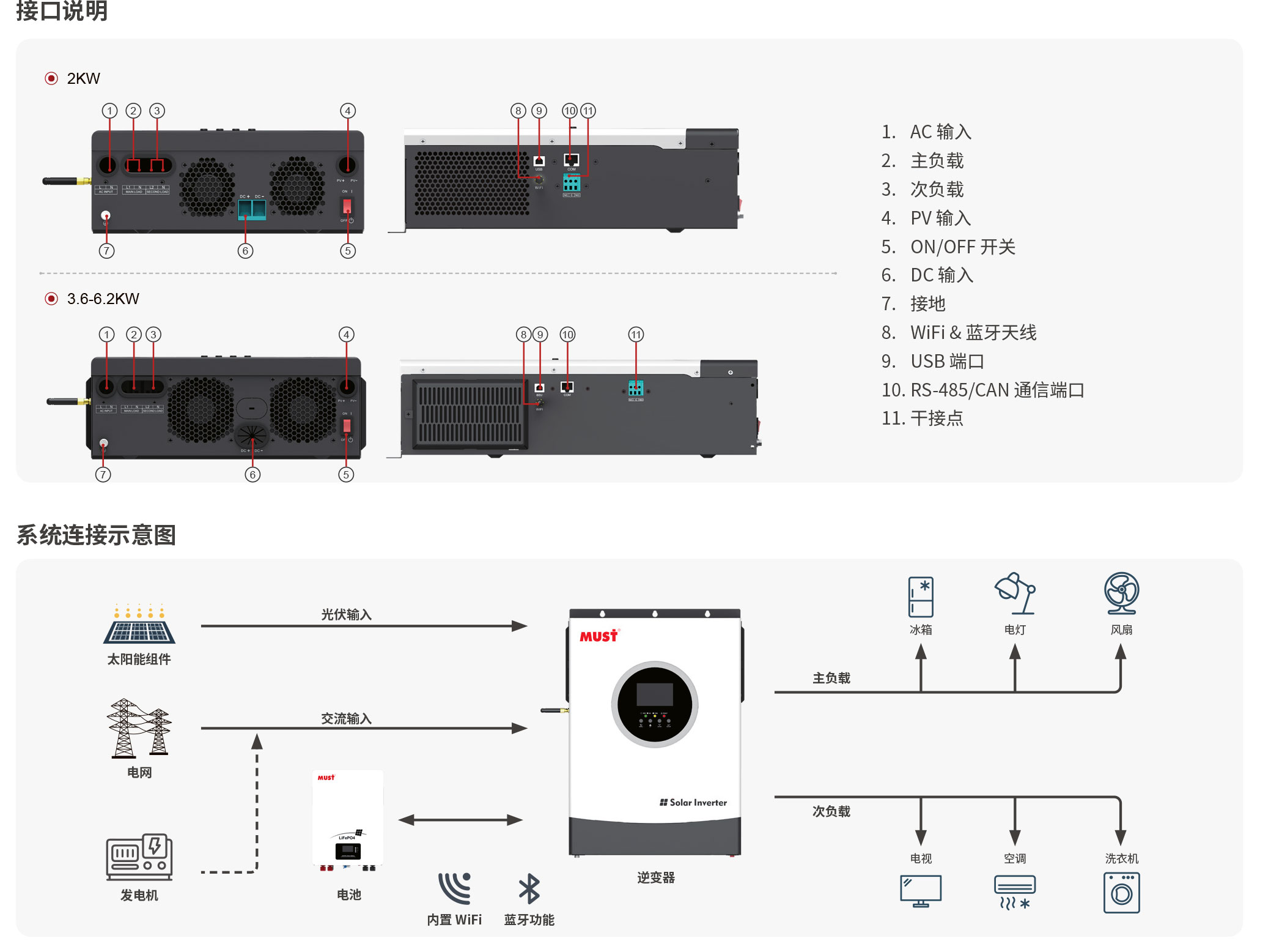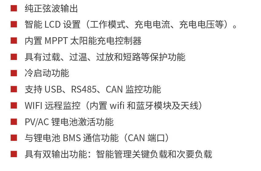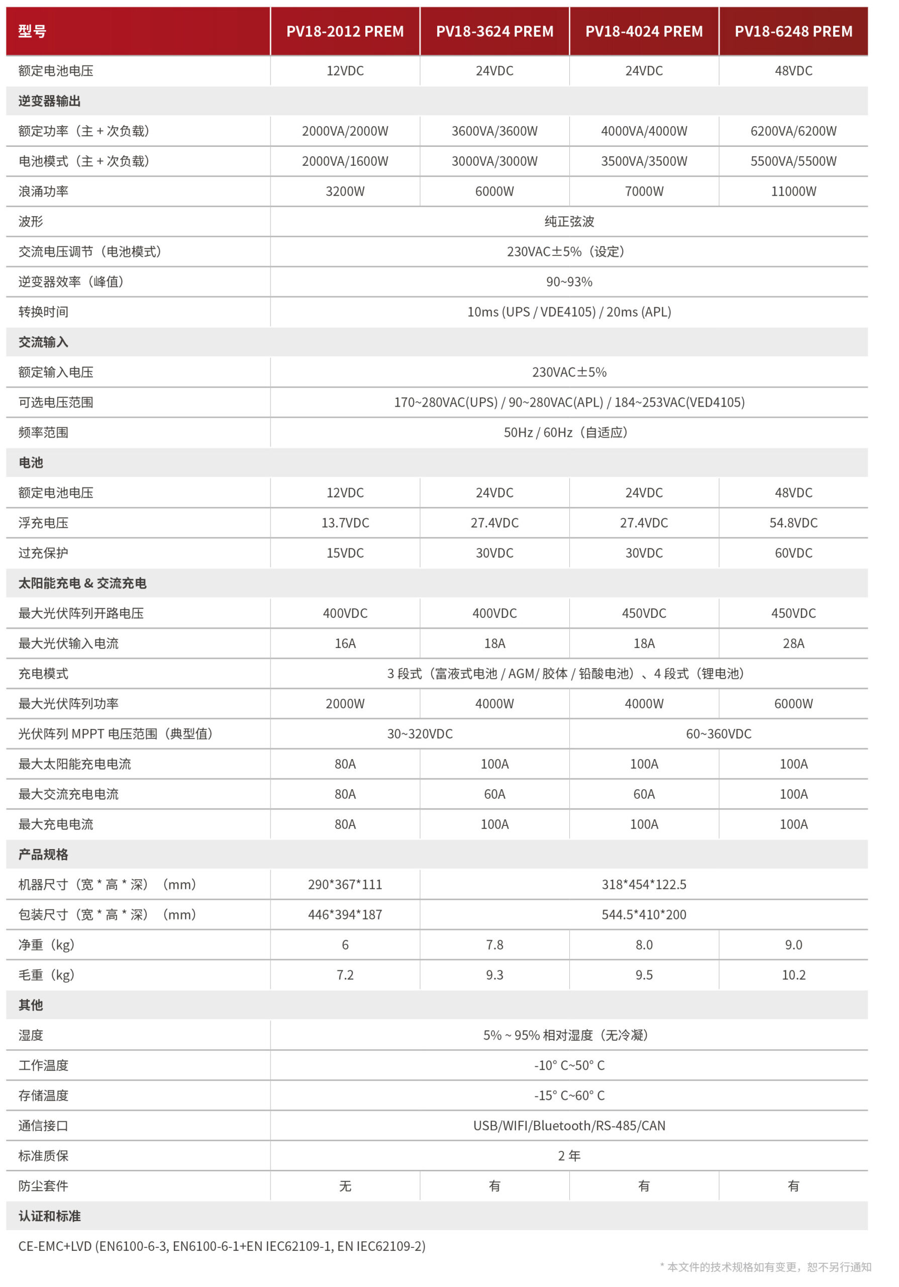 PV1800 PREM 是一款正弦波離網雙輸出逆變器,結合了逆變器、MPPT 太陽能充電器和市電充電和旁路輸出的功能,可為負載提供不間斷的電源輸出。無需電池即可運行。最大光伏陣列開路電壓可達 400V/450V,安裝太陽能板更加簡捷。