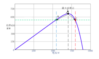 由組件輸出特性可知,在主動超配時,由于系統部分時間段內出現了限功率運行,逆變器控制組件輸出偏離最大功率點,如下圖所示,當工作點由A點向右偏離到C點時,組件輸出電流減小,輸出電壓將升高。
