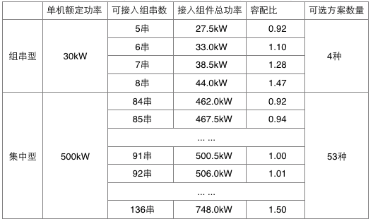 以國內市場上主流的30KW額定功率的組串逆變器、和500KW額定功率的集中逆變器,可實現超配的容配比方案進行比較,如下表: