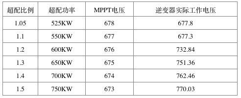 由圖1曲線可見,當超配的功率越大,被限制的功率也就越大,每塊組件的輸出電流越小,組件工作點越向右偏移,電壓越大,也就是說,超配功率越大,輸出電壓越高。通過分析計算,可獲得不同容配比下逆變器實際工作電壓如表2所示。可見,當容配比為1.5倍時,逆變器實際工作電壓電壓從MPPT電壓673V抬升到770V,在逆變器的允許工作范圍內。也就是說,即使在超配1.5倍時,系統的直流電壓也不會影響逆變器的安全運行。