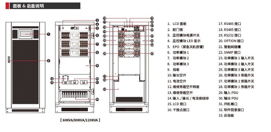 • 豐富的通訊接口,包括 RS232,RS485,USB,干接點,以及 SNMP(選配)卡。