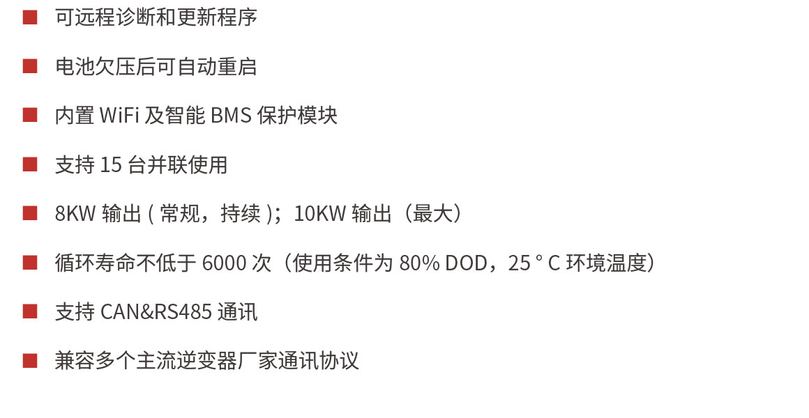 - 采用以穩定和安全著稱的LiFePO4 鋰電芯,由最先進的電池管理系統監控,防止過充、過流和短路