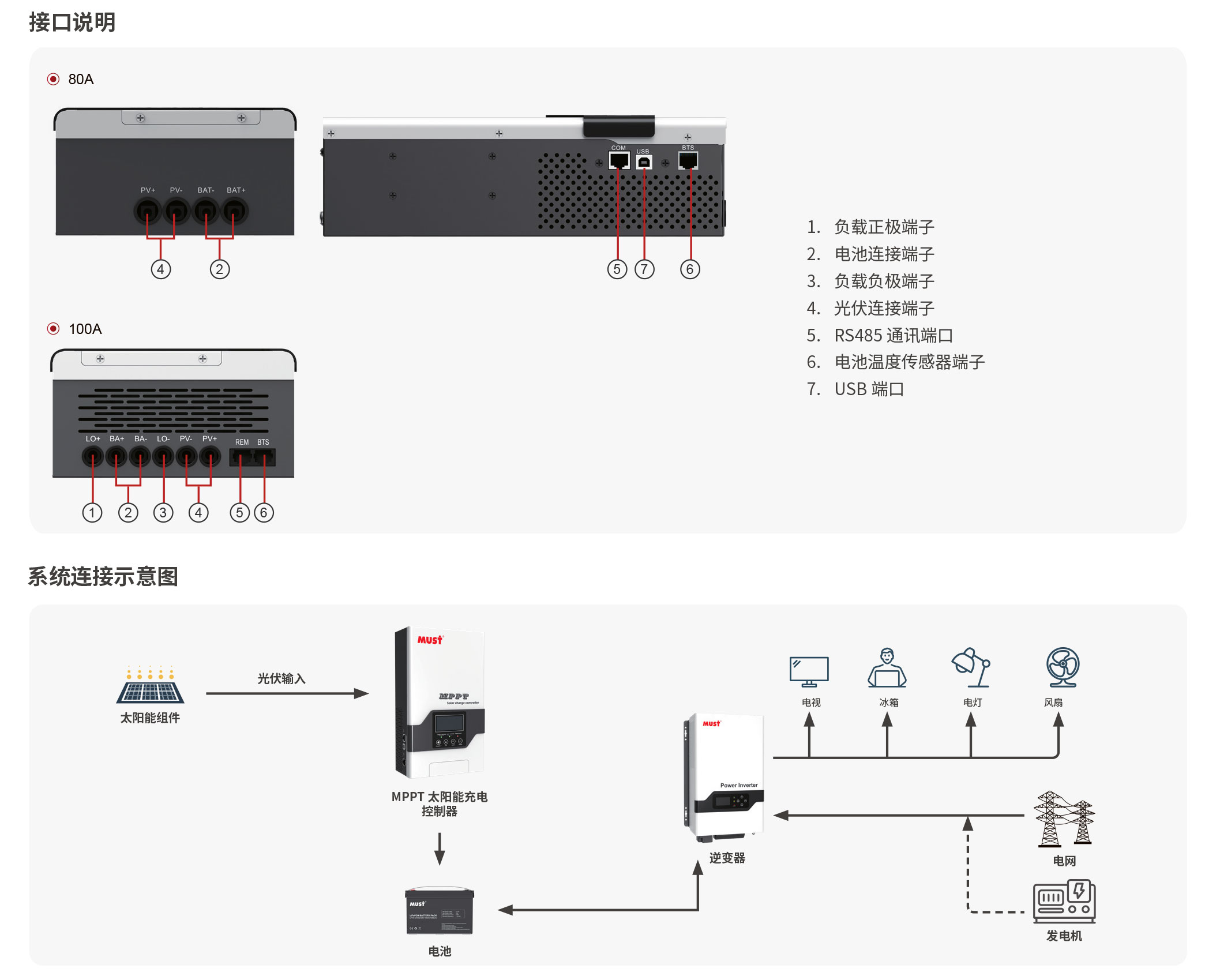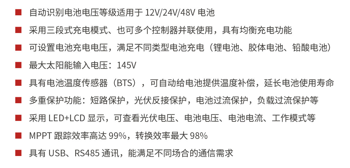• 采用三段式充電模式、也可多個控制器并聯使用,具有均衡充電功能