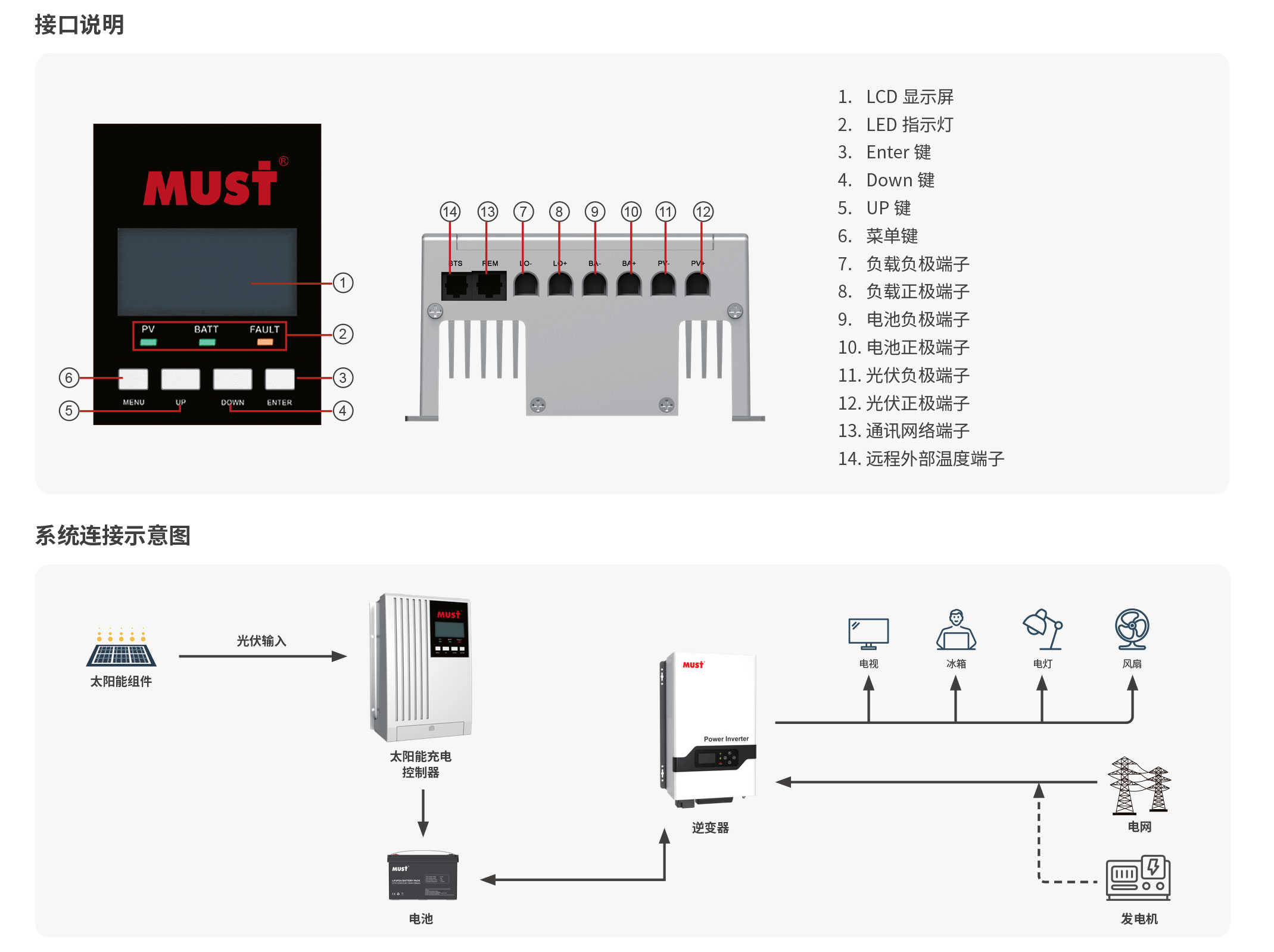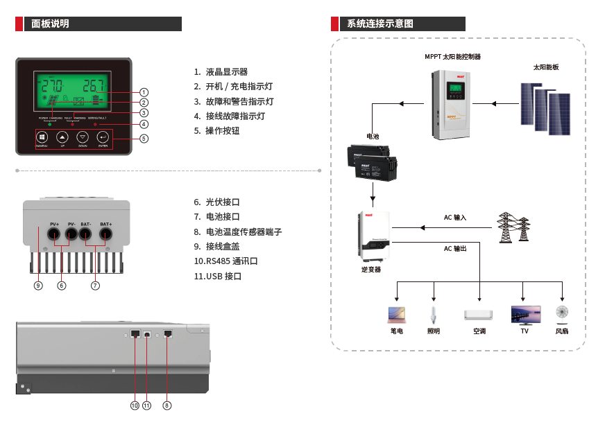 • 采用 LED+LCD 顯示,可查看光伏電壓、電池電壓、電池電流、工作模式等